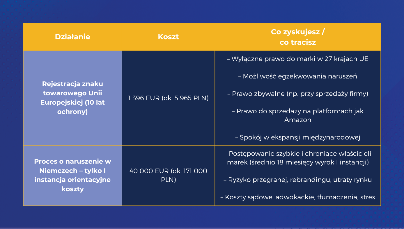 • Posiadanie zarejestrowanego znaku ułatwia usuwanie naruszeń z platform e-commerce (np. Allegro, Amazon, eBay),